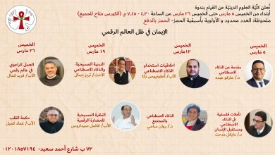 “إِن ثَبتُّم في كلامي كُنتُم تلاميذي حَقاً، تَعرِفونَ الحَقّ: والحَقُّ يُحَرِّرُكُم” يوحنا ٣٤/٨ تحرص كلية العلوم اللاهوتيّة بالسكاكينيّ بإقامة قداس في كل ترم دراسيّ يجمع الطلبة والطالبات كجماعة واحدة تتأمل وتتعمق في الكلمة، وأيضًا جماعة مصليّة تتحد…