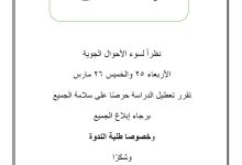 نظراً لسوء الأحوال الجوية الأربعاء 25 والخميس 26 مارس تقرر تعطيل الدراسة حرصًا على سلامة الجميع برجاء إبلاغ الجميع وخصوصا طلبة الندوة وشكرًا